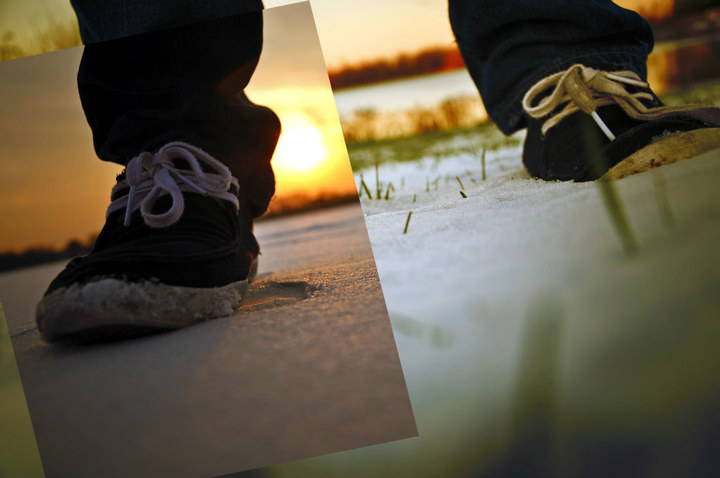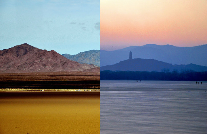左:北京颐和园,冬天,一个小孩看着结冰的湖面,穿着厚厚羽绒服; 右:La Jolla, Black's Beach, 一个中年男人看着大海,光着屁股,戴着帽子。